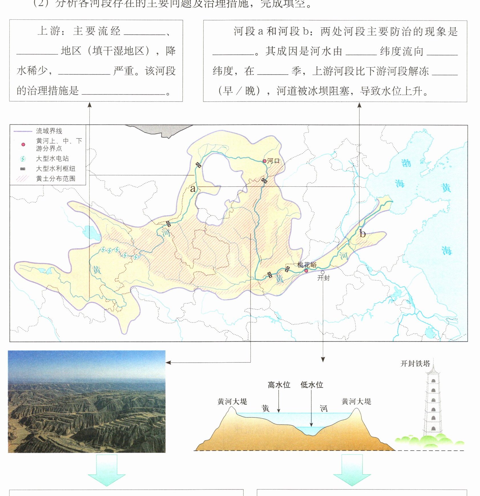 (2)上游:干旱 半干旱 荒漠化 加强生态环境建设等 河段a和河段b:凌汛 低 高 春 早 中游:黄土高原 多 疏松 植被 夏 暴雨 水土流失 开展水土保持综合治理,修建水利枢纽调水调沙等 下游:华北 河道 流速 泥沙 河床 高 地上河 加固黄河大堤等