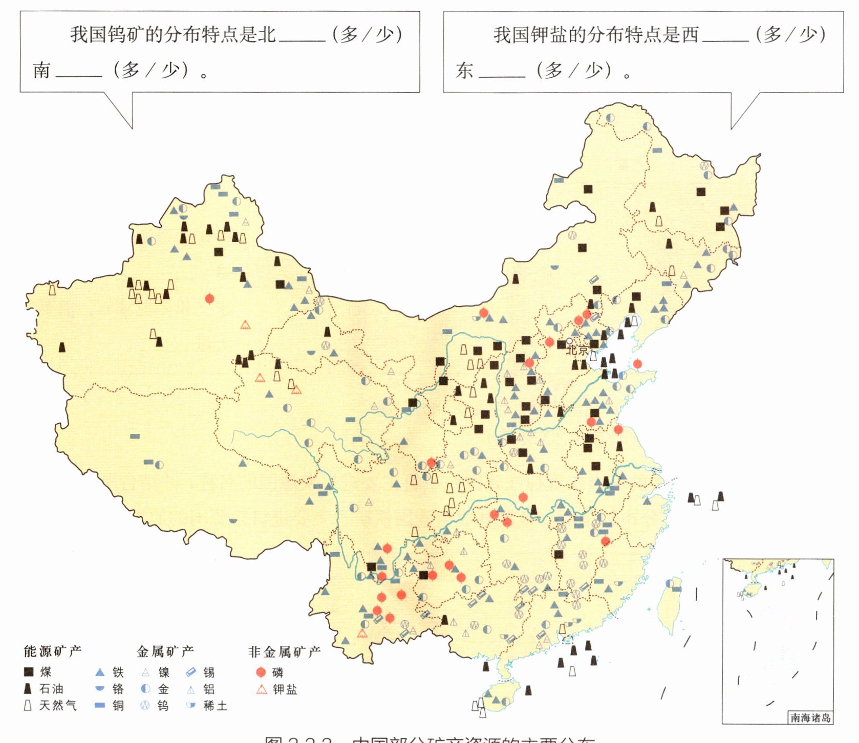 (1) 在图 3.3.3 中圈出我国钨矿和钾盐的主要分布区,并归纳其分布特点,完成图 3.3.3 上方填空。