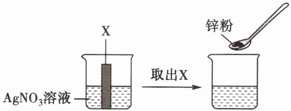 9. 如下图,将金属X浸入烧杯内的$AgNO_3$溶液中,观察到溶液颜色变蓝后取出X,向烧杯内再加入一定量锌粉,振荡后,溶液蓝色逐渐消失。