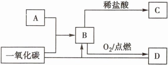 ;B→D的化学方程式为$3Fe + 2O_2 \xrightarrow{点燃} Fe_3O_4$
