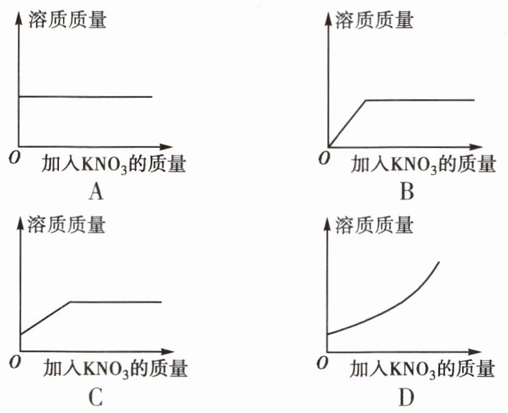 (此处有四个溶质质量随加入$KNO_3$质量变化的图像选项,A图像溶质质量一直不变,B图像溶质质量先增加后不变,C图像溶质质量一直增加,D图像溶质质量增加幅度越来越大)