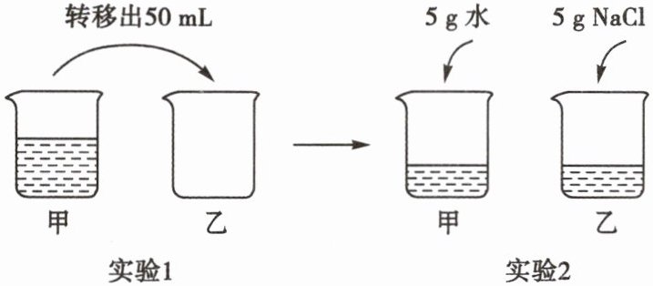(实验1:从甲烧杯转移出50mL到乙烧杯;实验2:向甲、乙烧杯分别加入5g水、5g NaCl)
