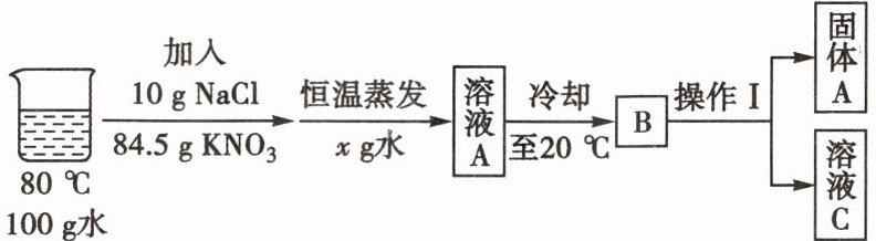 (填“蒸发结晶”或“降温结晶”)、过滤、洗涤、干燥的方法提纯$KNO_{3}$晶体。(5)$80^{\circ}C$时,在$100g水中加入10gNaCl和84.5gKNO_{3}$,并进行如下一系列实验,已知溶液 A 中$KNO_{3}$恰好饱和,请回答相关问题。