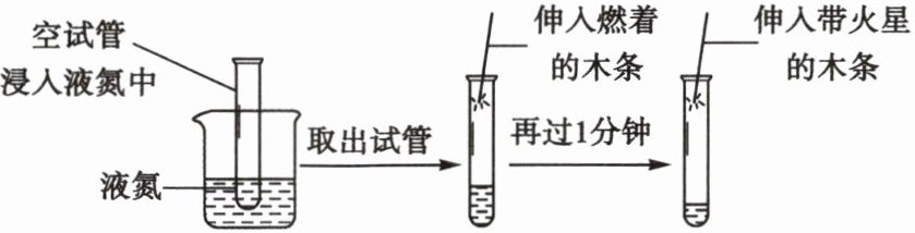浸入液氮一段时间后,试管内产生一定体积的液态空气。取出试管,液态空气沸腾,伸入燃着的木条,木条熄灭的原因是________________;1分钟后伸入带火星的木条,观察到木条复燃,导致木条复燃的原因是________________。