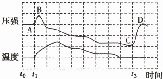 - 选项D:在$t_2$时刻,温度恢复至室温,压强增大,对应的实验操作为打开了弹簧夹,该选项说法正确。