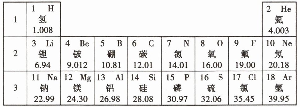 | 3 | 11 Na 钠 22.99 | 12 Mg 镁 24.30 | 13 Al 铝 26.98 | 14 Si 硅 28.08 | 15 P 磷 30.97 | 16 S 硫 32.06 | 17 Cl 氯 35.45 | 18 Ar 氩 39.95 |