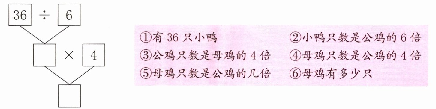 ①有36只小鸭②小鸭只数是公鸡的6倍③公鸡只数是母鸡的4倍④母鸡只数是公鸡的4倍⑤母鸡只数是公鸡的几倍⑥母鸡有多少只