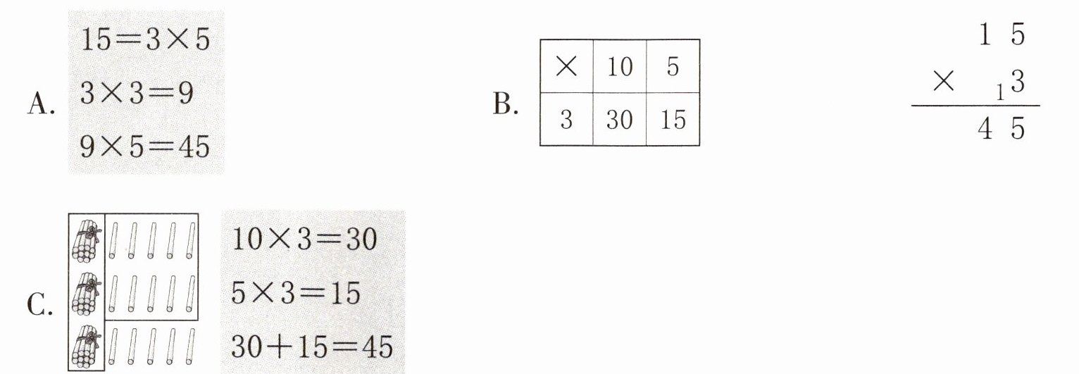 )。A.$\begin{array}{l}15 = 3×5\\3×3 = 9\\9×5 = 45\end{array} $