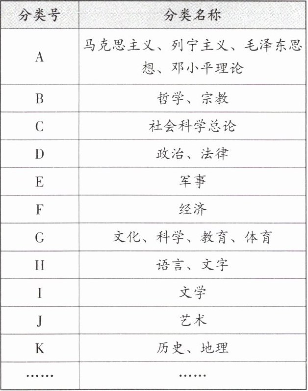 2. 右表是我国图书馆分类法,如 G 表示文化、科学、教育、体育类,I 表示文学类,等等。J - 6 - 4 - 563/2 表示这是一本艺术类图书,它在该图书馆中的位置为 6 号书架第 4 层,本书架内的序号是 563,该图书馆中共有 2 本。想一想:《西游记》的图书编码是 I - 9 - 3 - 326/8,那么这本书属于(