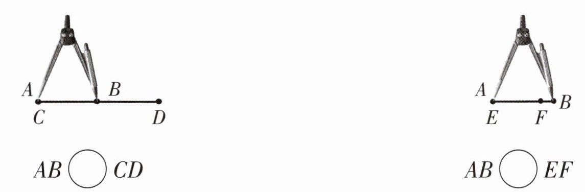 2. 明明用圆规比较线段 $ AB $ 和 $ CD $、$ EF $ 的长短。结合以下情况进行判断。
