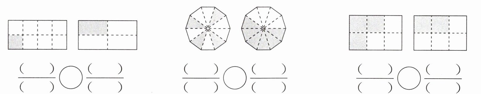 2. 把下面各图中的涂色部分用分数表示出来,再比较每组分数的大小。