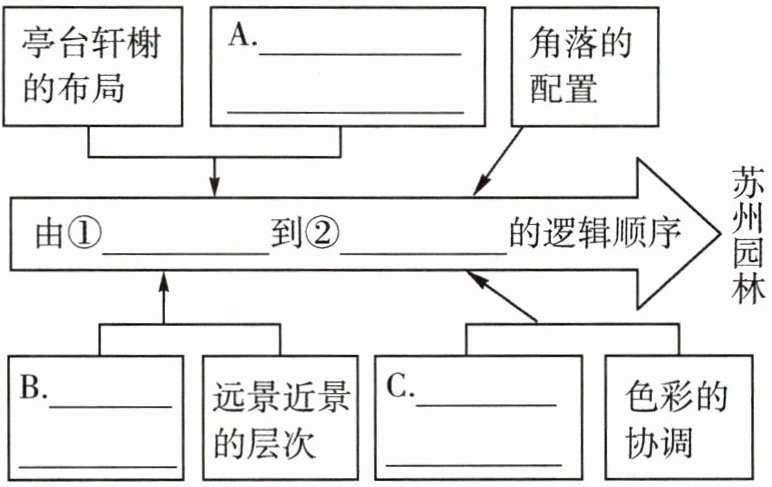 ①主要 ②次要 A 假山池沼的配合 B花草树木的映衬 C门窗的雕琢