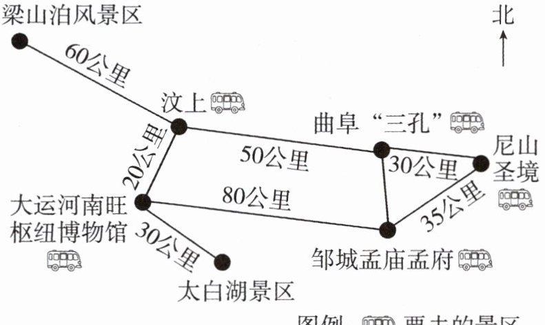 【示例】同学们,我们从汶上出发,先向西南方向行进20公里前往大运河南旺枢纽博物馆,之后往东南80公里到邹城孟庙孟府,然后再向东北行进35公里抵达尼山圣境,之后向西行进30公里参观曲阜“三孔”,最后继续向西行进50公里回到汶上。
