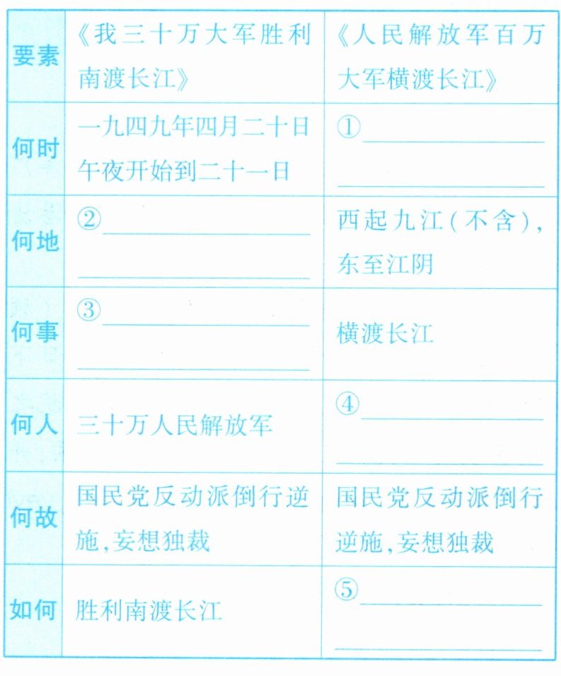 ①一九四九年四月二十日夜起到二十二日二十二时 ②芜湖、安庆之间 ③南渡长江 ④人民解放军百万大军 ⑤中路军已渡过三十万人,西路军、东路军已渡过大部,余部二十三日可渡完