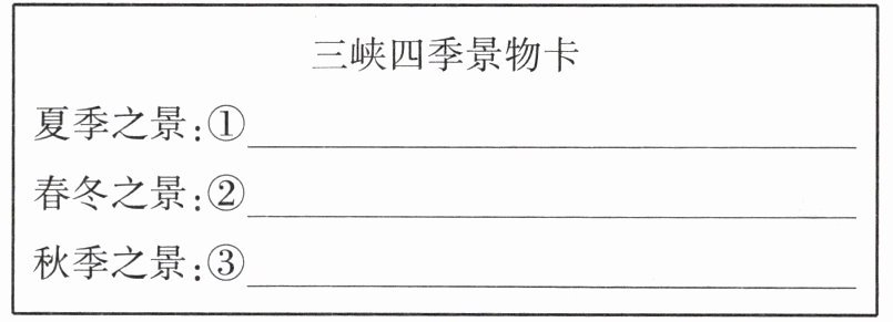 九、自主完成“三峡四季景物卡”。结合文中关键词句,分别用四字短语归纳概括夏、春冬、秋各季的典型景物特征。