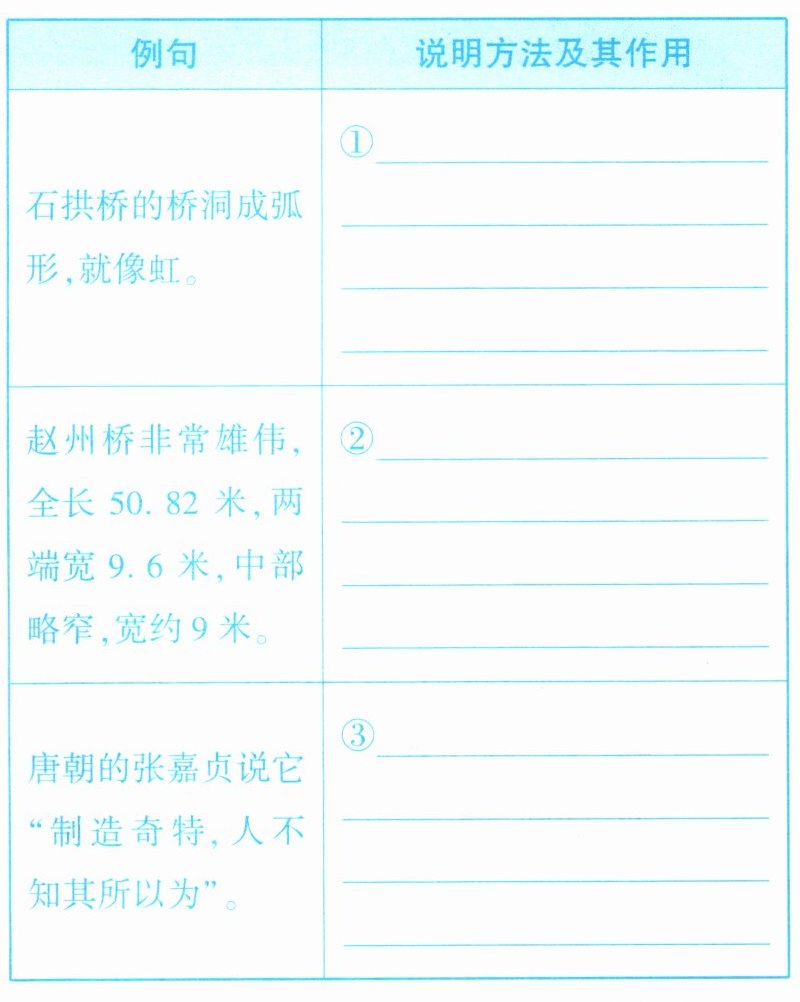 ①打比方,用"虹"作比,突出了石拱桥形式上的特征,富有形象性。 ②列数字,运用了具体、准确的数字,说明了赵州桥雄伟的特点。③引用,引用张嘉贞的话,说明赵州桥设计施工的精巧,增强了文章的说服力和感染力。