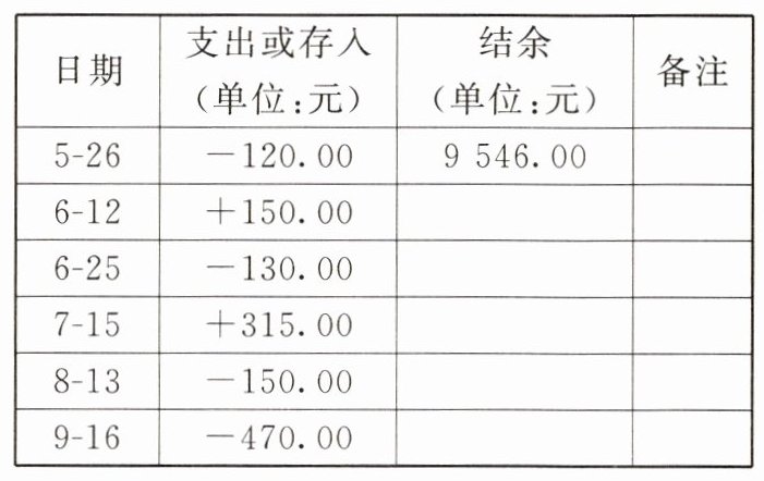 (2)9 546+150+(-130)+315+(-150)+(-470)=9 261(元),故这一页最后的结余为9 261元。