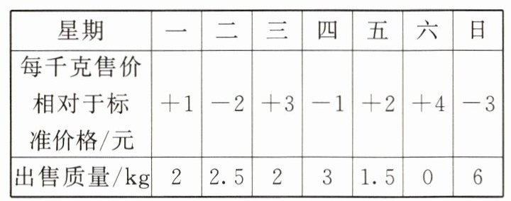 9.(数学应用)某水果超市新进了一批百香果共25kg,每千克成本8元。为了合理定价,在第一周试行浮动价格,售价以每千克12元为标准,超出12元的部分记为正,不足12元的部分记为负,超市记录第一周百香果的售价和出售质量情况如下表。