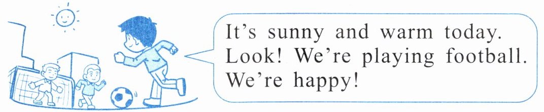 1. sunny 2. is flying a kite 3. Look 4. rainy and cool