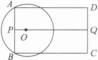 9. 如图,在矩形$ABCD$中,$AB = 6$,$BC = 10$,$P$,$Q分别是AB$,$CD$的中点,点$O从点P$出发以每秒 1 个单位长度的速度沿射线$PQ运动t\ s$,以点$O$为圆心. 以$OA$为半径画圆. 当$\odot O上有且只有一点到直线CD$的距离为 1 时,$t$的值为______。