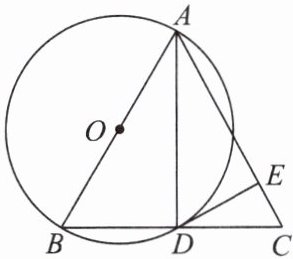 12. 如图,在△ABC 中,AB = AC,以 AB 为直径的⊙O 与 BC 交于点 D,过点 D 作⊙O 的切线交 AC 于点 E.