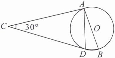 2. 如图,$AB是\odot O$的直径,点$C为\odot O$外一点,$CA$,$CD是\odot O$的切线,$A$,$D$为切点,连接$BD$,$AD$。若$\angle ACD = 30^{\circ}$,则$\angle DBA$的度数为( )