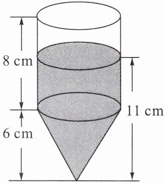 13. 如图,有一个下面是圆锥、上面是圆柱的容器,圆锥的高是 6 cm,圆柱的高是 8 cm,从圆锥的尖到容器里的液面高是 11 cm. 当将这个容器倒过来放平时,容器里的液面高是多少厘米?
