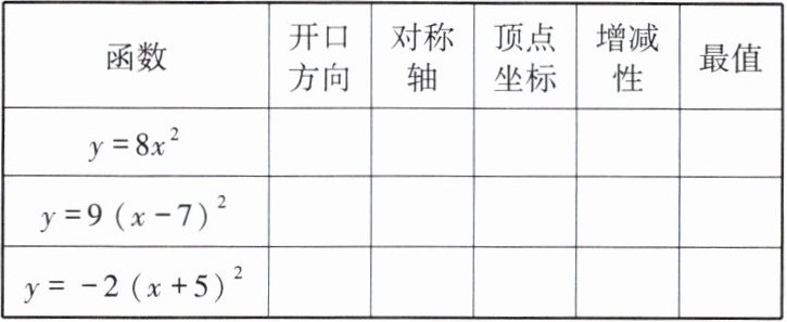 | $ y = 9(x - 7)^2 $ | 向上 | $x=7$ | $(7,0)$ | $x<7$时y随x增大而减小,$x>7$时y随x增大而增大 | 最小值0 |