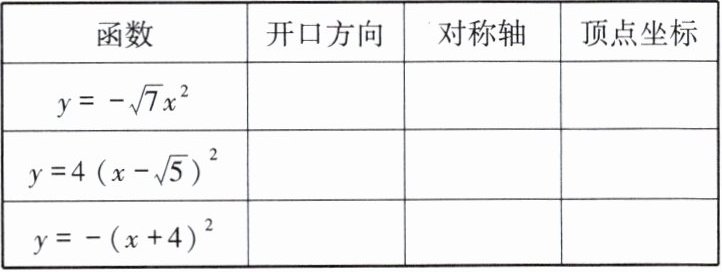 | $ y = -\sqrt{7}x^2 $ | 向下 | $x=0$(y轴) | $(0,0)$ |
