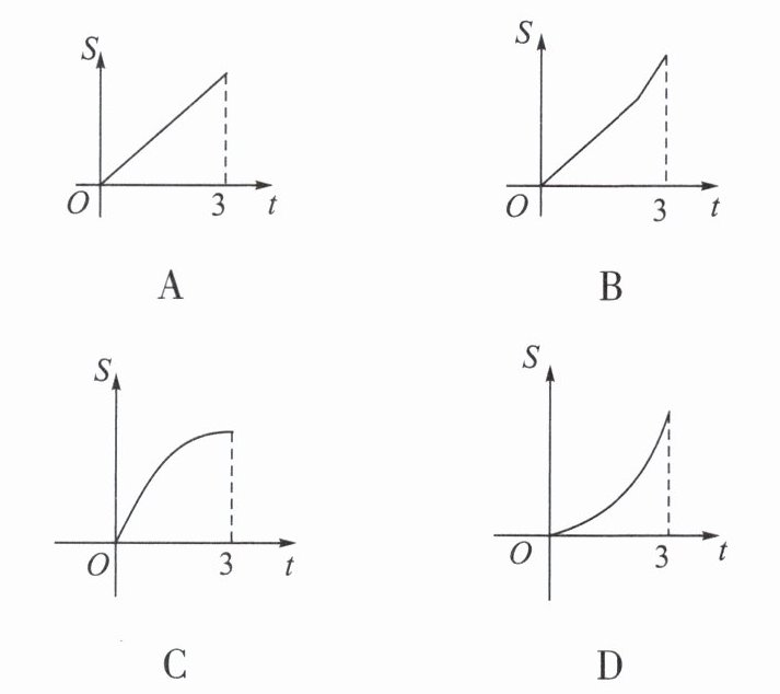 9. 如图,在 $ Rt \triangle AOB $ 中,$ AB \perp OB $,且 $ AB = OB = 3 $。设直线 $ x = t $ 截此三角形所得阴影部分的面积为 $ S $,则 $ S $ 与 $ t $ 之间的函数关系的图象为( )