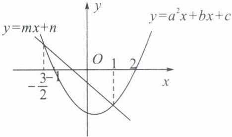 9. 直线 $y = mx + n$ 和抛物线 $y = ax^{2} + bx + c$ 在同一坐标系中的位置如图所示,那么不等式 $mx + n < ax^{2} + bx + c < 0$ 的解集是___.