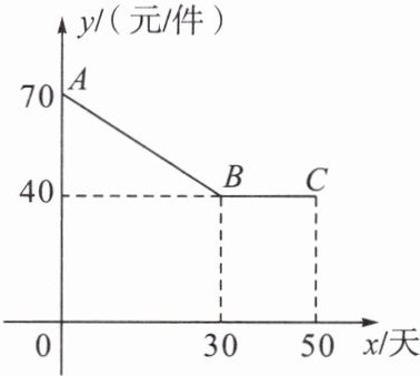 13. 某工厂用50天时间生产一款新型节能产品,每天生产的该产品被某网店以每件80元的价格全部订购. 在生产过程中,由于技术的不断更新,该产品第x天的生产成本y(元/件)与x(天)之间的关系如图所示,第x天该产品的生产量z(件)与x(天)满足关系式 $ z = -2x + 120 $.