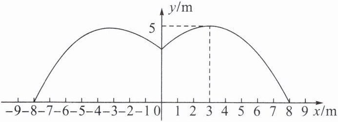 12. 某游乐园有一个直径为16m的圆形喷水池,喷水池的周边有一圈喷水头,喷出的水柱为抛物线,在距水池中心3m处达到最高,高度为5m,且各方向喷出的水柱恰好在喷水池中心的装饰物处汇合. 如图所示,以水平方向为x轴,喷水池中心为原点建立直角坐标系.