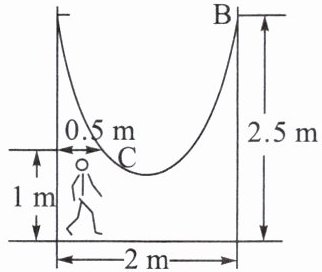 11. 如图,小明的父亲在相距2m的两棵树间拴一根绳子,拴绳子的地方距地面高都是2.5m,绳子自然下垂呈抛物线形,身高1m的小明距较近的那棵树0.5m时,头部刚好接触到绳子,绳子最低点距地面是多少米?