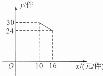 11. 某景区商店销售一种纪念品,这种商品的成本价为$10$元/件. 已知销售价不低于成本价,且物价部门规定这种商品的销售价不高于$16$元/件. 市场调查发现,该商品每天的销售量$y$(件)与销售价$x$(元/件)之间的函数关系如图所示.