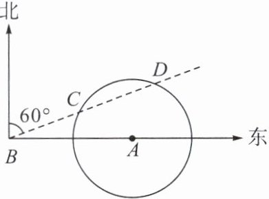 2. 如图,在气象站A的正西方向240km的B处有一台风中心,该台风中心以每小时20km的速度沿北偏东60°的BD方向移动,在距离台风中心130km内的地方都要受其影响.