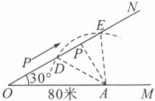 如图,有两条公路OM,ON相交成30°角,沿公路OM方向离点O80米处有一所学校A,当重型运输卡车P沿道路ON方向行驶时,在以点P为圆心、50米长为半径的圆形区域内都会受到卡车噪声的影响,且卡车与学校A的距离越近噪声影响越大,若已知重型运输卡车P沿道路ON方向行驶的速度为18千米/时.