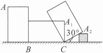 10. 如图,一长4cm、宽3cm的长方形木板在桌面上作无滑动的翻滚(顺时针方向),木板上点A位置变化为$ A \to A_1 \to A_2 $,其中第二次翻滚被桌面上一小木块挡住,使木板与桌面成$ 30° $角,则点A翻滚到$ A_2 $位置时共走过的路径长为______cm.