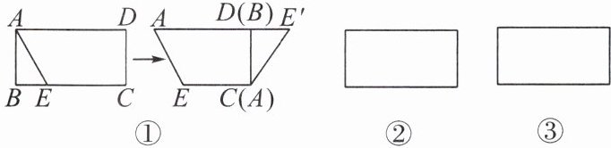 13. 我们通常可以对一些图形进行剪切,并利用图形的轴对称、平移、旋转等进行图案设计.如图①,可以沿线段AE剪切矩形ABCD,再将$ \triangle ABE $通过变换与梯形AECD拼接成等腰梯形.请按下列要求进行图案设计: