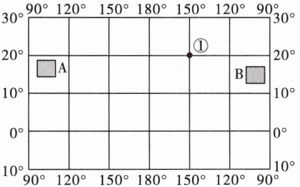 2. 2024年9月5日13时,台风“摩羯”中心所在海域大致位于图中____(填“A”或“B”)海域附近,该海域位于____(填“东”或“西”)半球。