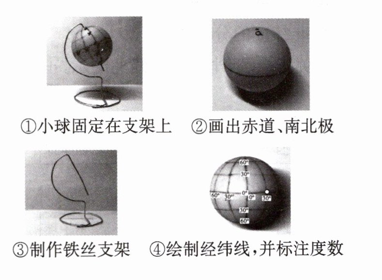小阳学习完地球仪的相关知识后,尝试自选材料制作简易地球仪,如图为制作过程的照片。据此完成1~2题。