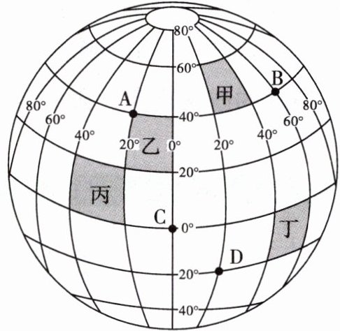 (2)图示A、B、C、D四点中,位于南北半球分界线上的是