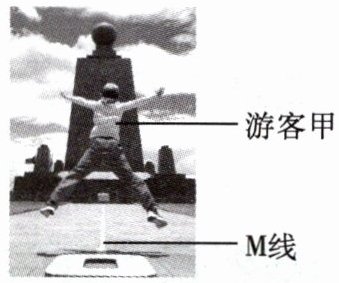 如图为厄瓜多尔方柱形赤道纪念碑。图中游客甲面向西方,双脚跨越M线起跳并拍照,以示自己同时站在南北两个半球上。据此完成14~15题。