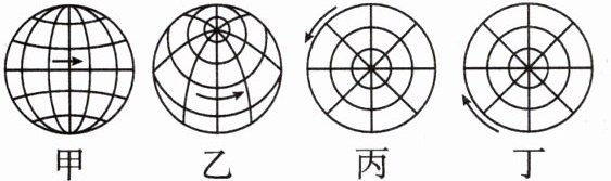 3. 右图中的①②③④箭头表示从不同方向观察地球仪演示地球的自转。图示四个方向观察所见的经纬网形状和自转方向与甲、乙、丙、丁四图对应一致的是(