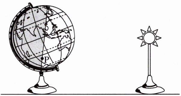 在暗室里,用电灯作为光源,照射地球仪,自西向东拨动地球仪,演示昼夜更替,如下图所示。据此完成9~10题。