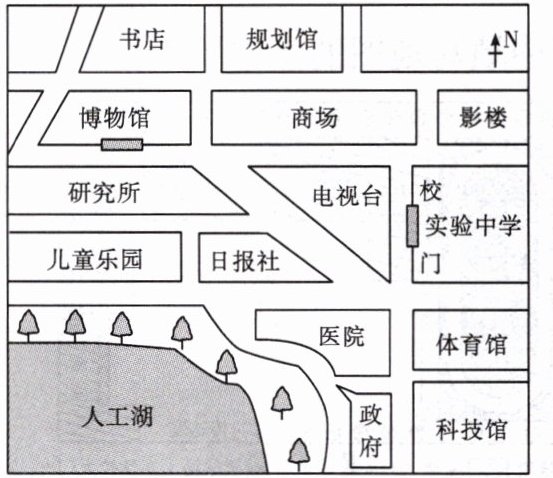 某市实验中学的学生利用周末到博物馆进行社会实践活动。下图为同学们绘制的学校周边区域简图。读图,完成5~6题。