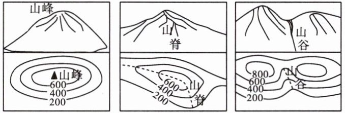 山谷和山脊的等高线特征可以简记为“凸高为谷,凸低为脊”。