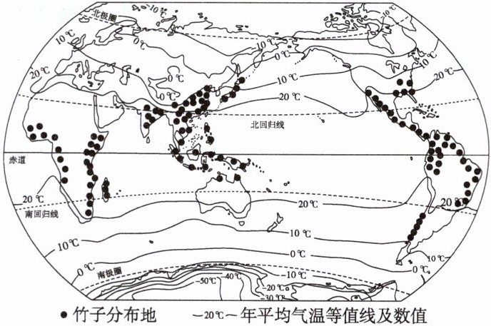 - [跨学科 生物] 竹子喜温暖湿润,对水热条件要求较高。如图为世界年平均气温及竹子分布图。据此完成 9~10 题。