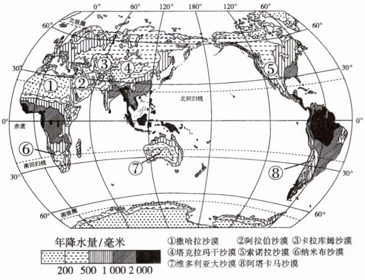 沙漠是地球上分布较广的一种地表景观。沙漠的形成是多种因素共同影响的结果。读世界部分沙漠位置示意和世界年降水量分布图,完成6~7题。
