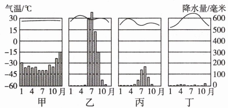 ;丙热带草原气候和乙热带季风气候终年高温,降水季节分配不均